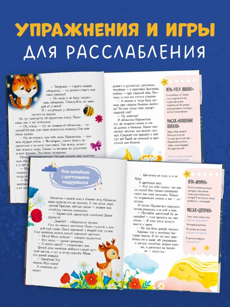 Главы со сказками сопровождают простые психологические упражнения и тактильные игры. Вы будете делать массаж, изображая капающий дождик, или рисовать на ладошках, нежно расслабляя малыша и помогая ему избавляться от негативных мыслей и переключаться с бодрствования на сон.