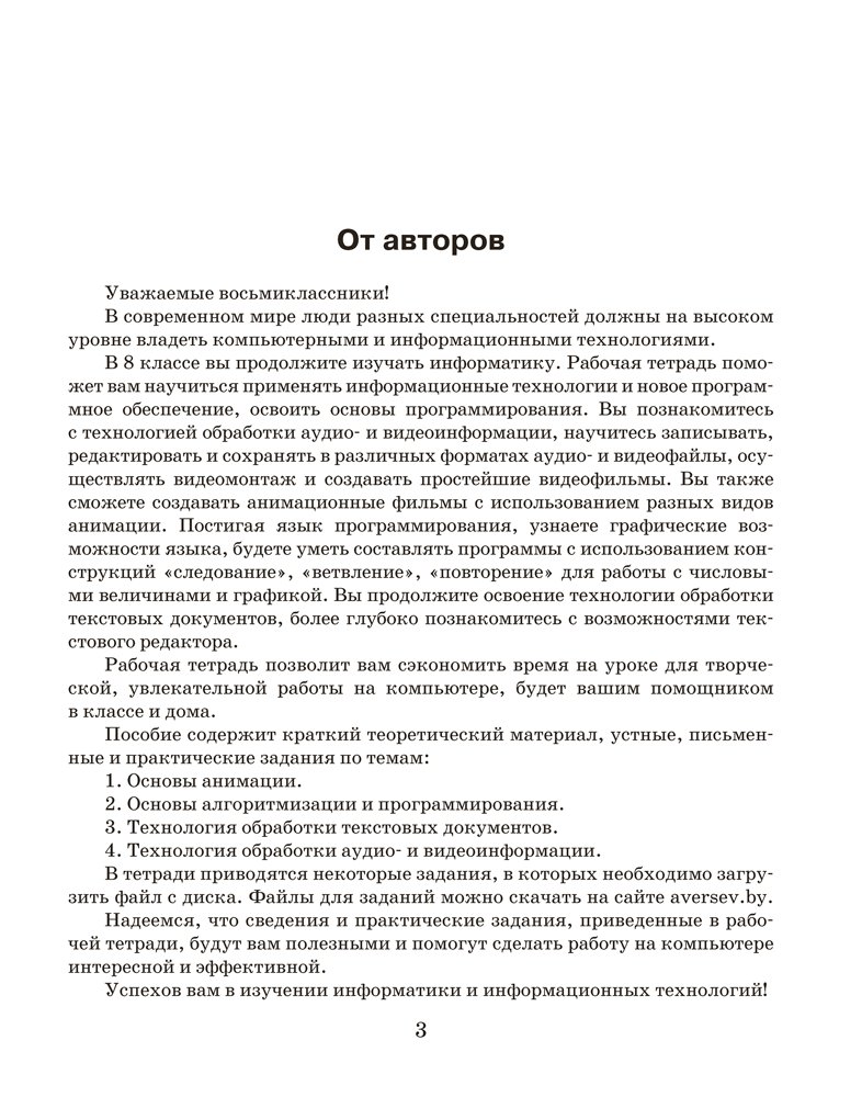 Рабочая тетрадь составлена в соответствии с учебной программой по информатике и содержит необходимый теоретический и практический материал по каждой изучаемой теме. Задания, представленные в пособии, направлены на формирование системного мышления и активизацию творческого потенциала, развитие умения находить нестандартные способы получения, осмысления и обработки информации.