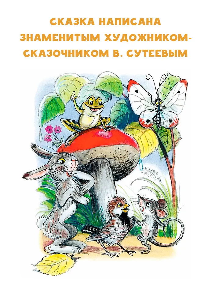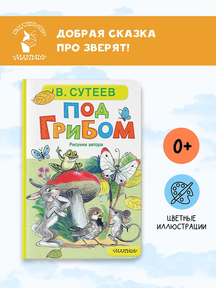 В книгу вошла сказка "Под грибом" знаменитого художника-сказочника В. Сутеева. Как-то раз застал Муравья сильный дождь. И спрятался он под маленьким грибком. Не успел дождь пройти, а под шляпкой гриба оказалась целая компания зверят — и Бабочка, и Мышка, и Воробей, и даже Заяц! Как все они поместились под грибом? Для детей до 3-х лет.