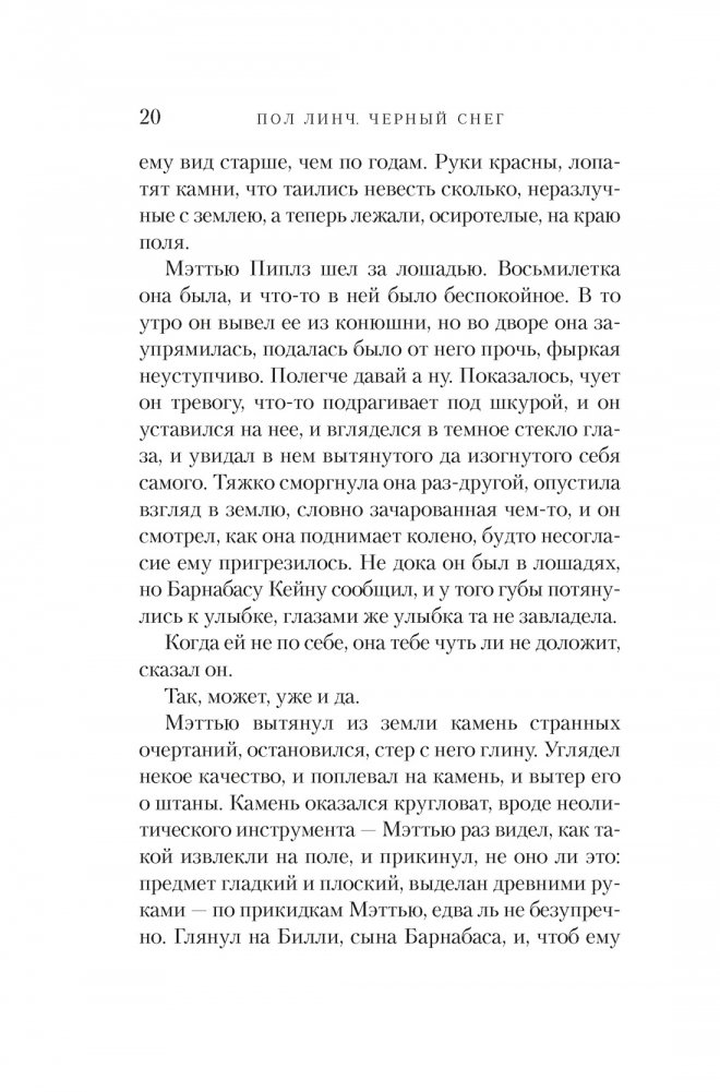 Впервые на русском — экзистенциальная пастораль современного ирландского классика Пола Линча, лауреата Букеровской премии 2023 года за роман «Песнь пророка», который уже называют «ирландским „1984“» и «новым „Рассказом служанки“». «Черный снег» — это «блестящая, гипнотическая книга» (Филипп Майер, автор романа «Сын»), рядом с которой «большая часть современной прозы ощутимо меркнет» (National Public Radio). Весной 1945-го Мэттью Пиплз вбегает в охваченный пожаром хлев, чтобы вывести запертый там скот, — и погибает. Хозяин фермы Барнабас Кейн, сокрушенный смертью друга, пытается восстанавливать хозяйство, но его жена Эскра задыхается от неуверенности в завтрашнем дне, а сын Билли тяготится под гнетом страшной тайны…