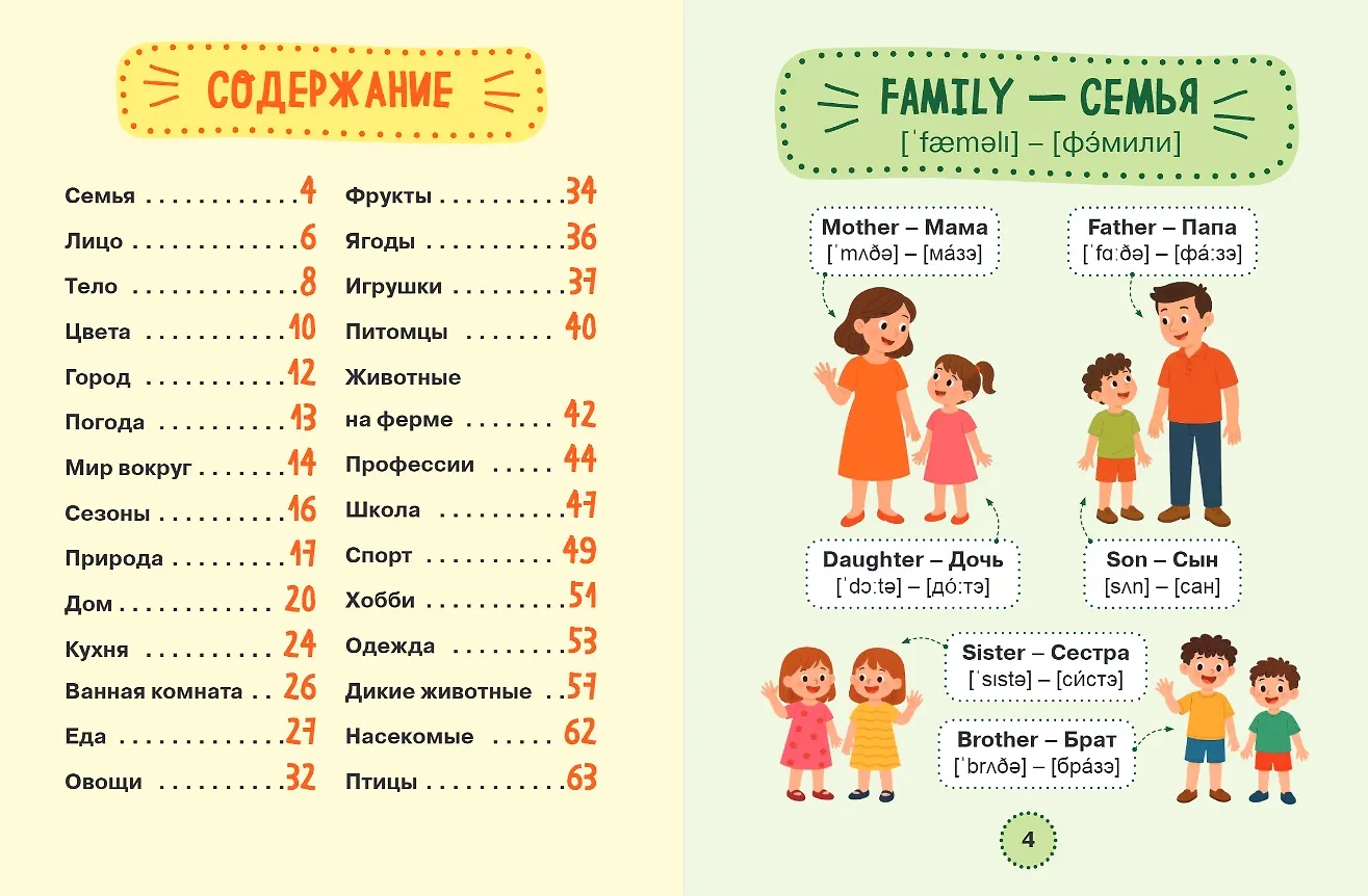 Визуальный словарь английского языка для детей — это наглядный и дружелюбный помощник в первых шагах изучения иностранного языка. Словарь включает базовую лексику, разделённую на 27 тематических блоков: животные, природа, семья, еда, цвета и другие важные для ребёнка темы. Каждое слово сопровождается переводом, транскрипцией на английском и русском языках, а также красочными авторскими иллюстрациями, которые делают запоминание лёгким, а обучение — увлекательным. Книга предназначена для занятий родителей с детьми - учите язык вместе с ребенком! Словарь помогает развивать зрительную память, ассоциативное мышление и формирует прочную основу для дальнейшего погружения в английский язык.