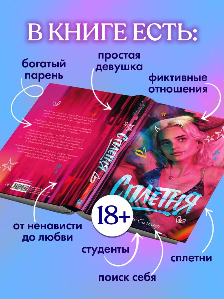 Увлекательная книга, женский роман с историей фиктивных отношений, прошедших путь «от ненависти до любви» с эмоциональной фотографией на обложке — отличный подарок и книжная радость женщине, девушке, подруге на любой праздник. Подарите книгу «Сплетня» всем, кто читает книги про любовь, любовные романы, захватывающие книги для взрослых и интересные книги Кати Саммер.