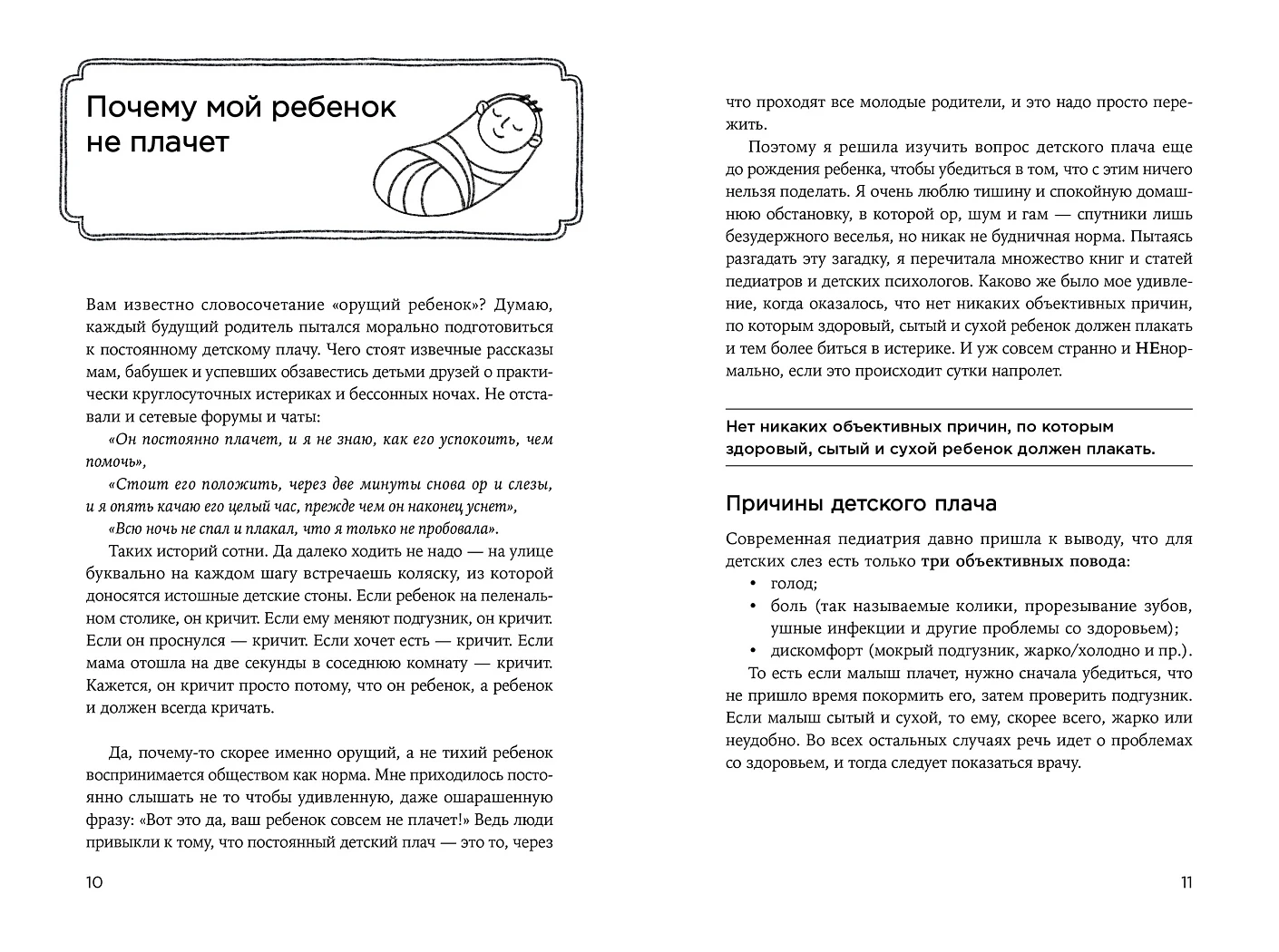 Ссылки на исследования детских психологов и педиатров, рубрики «Вопрос-ответ», чтобы быстро получить ответ на волнующие вопросы, четкая структура книги, охватывающая все аспекты жизни после появления младенца.