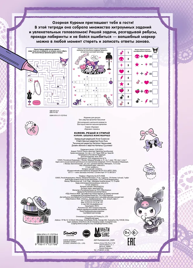Озорная Куроми приглашает тебя в гости! В этой тетради она собрала множество хитроумных заданий и увлекательных головоломок! Решай задачи, разгадывай ребусы, проходи лабиринты и не бойся ошибиться – волшебный маркер можно в любой момент стереть и записать ответы заново.