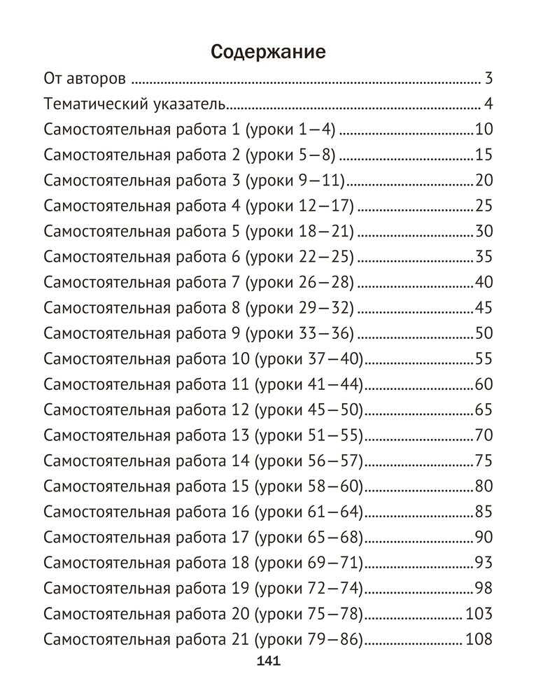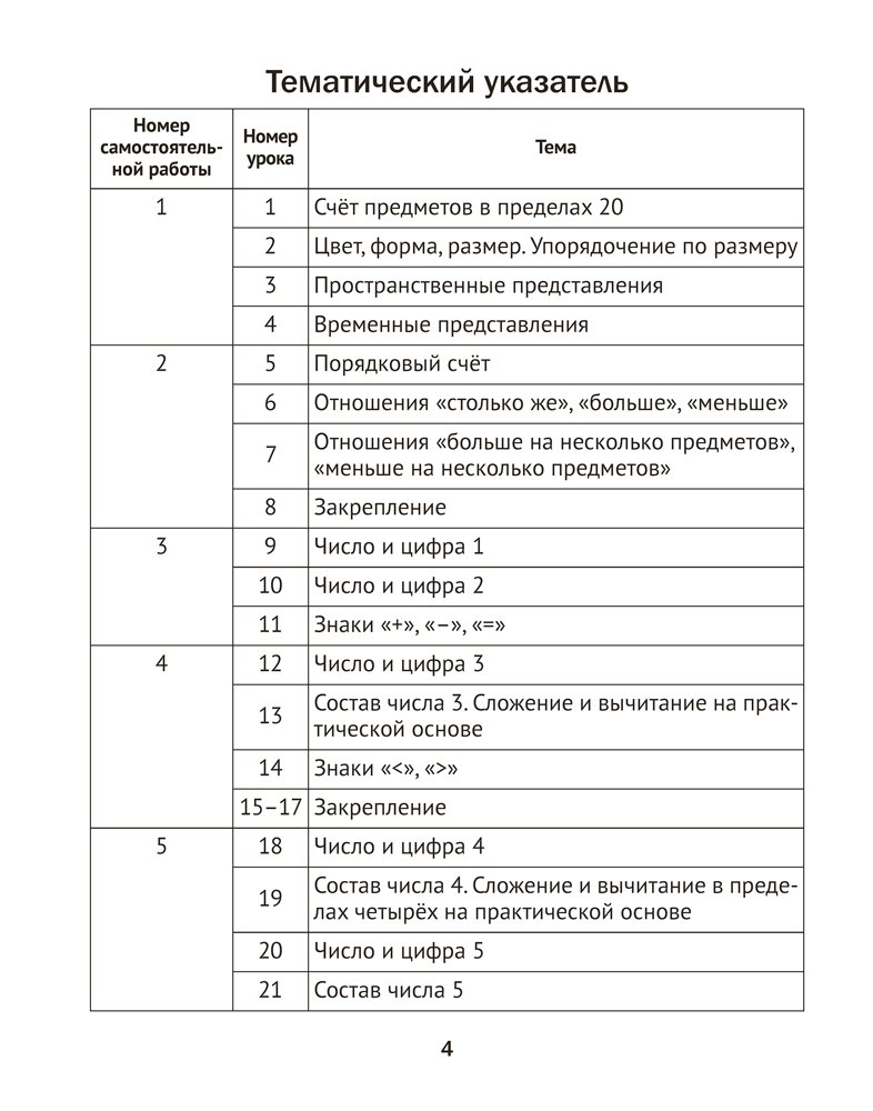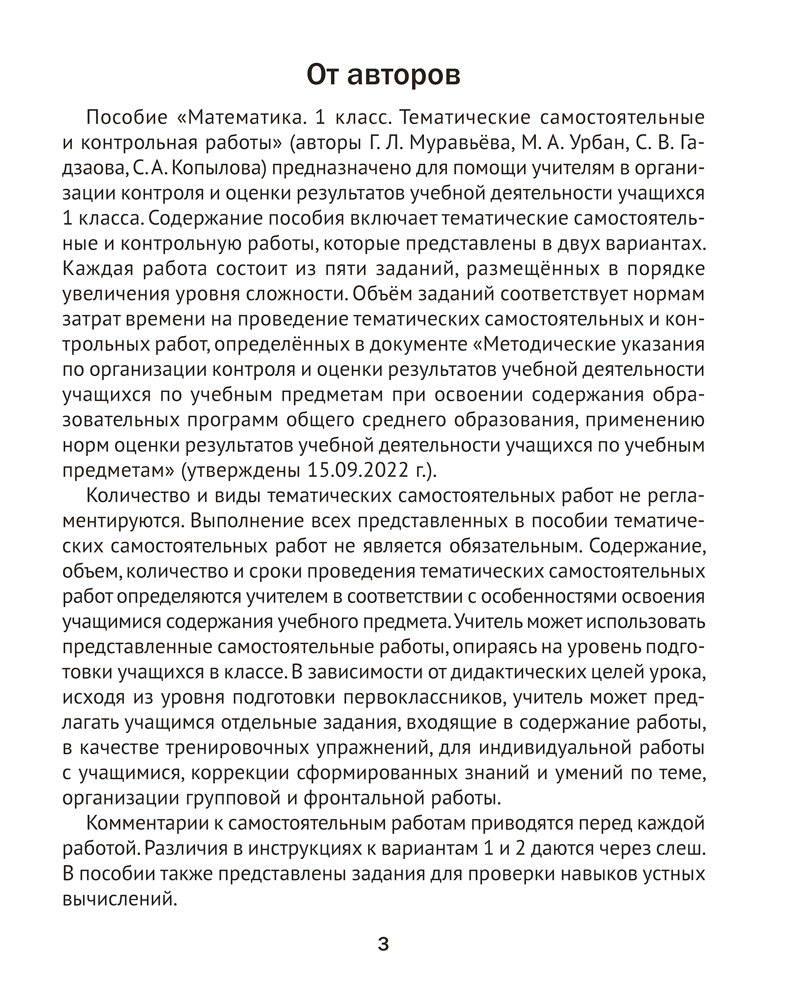 Пособие составлено в соответствии с учебной программой и содержит тематические самостоятельные и контрольную работы, представленные в двух вариантах. Каждая самостоятельная работа относится к указанным в издании урокам учебника «Математика. 1 класс» (авторы Г. Л. Муравьёва, М. А. Урбан). В пособии также приведены задания для проверки навыков устного счёта.