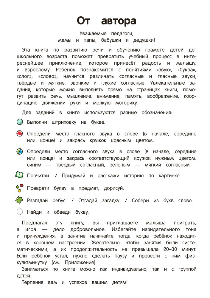 Книга познакомит детей с такими понятиями, как звук, слог, слово, согласные и гласные звуки, подготовит к курсу «Обучение грамоте» в школе. Увлекательные задания, которые можно выполнять на страницах пособия, помогут в развитии речи, мышления, внимания, памяти, воображения, а также координации движений рук и мелкой моторики.