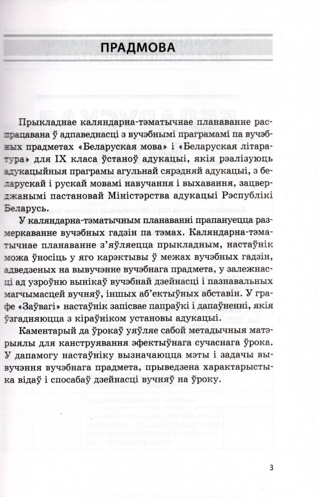 Прыкладнае каляндарна-тэматычнае планаванне распрацавана ў адпаведнасці з вучэбнымі праграмамі па вучэбных прадметах "Беларуская мова" і "Беларуская літаратура" для IX класа ўстаноў адукацыі, якія рэалізуюць адукацыйныя праграмы агульнай сярэдняй адукацыі, з беларускай і рускай мовамі навучання і выхавання, зацверджанымі пастановай Міністэрства адукацыі Рэспублікі Беларусь.