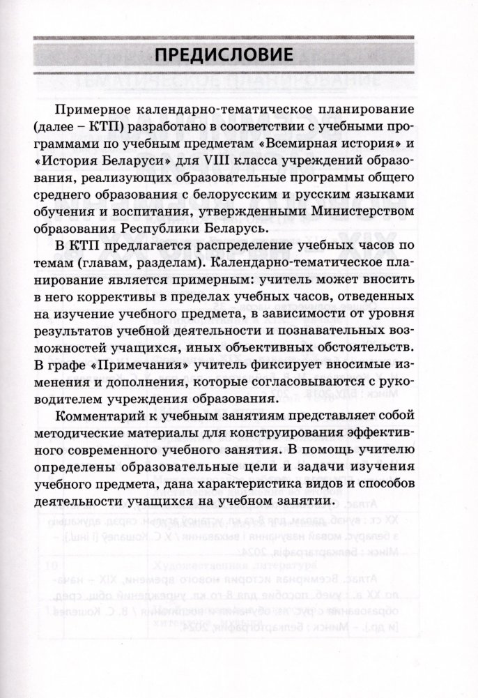 Примерное календарно-тематическое планирование разработано в соответствии с учебными программами по учебным предметам "Всемирная история" и "История Беларуси" для VIII класса учреждений образования, реализующих образовательные программы общего среднего образования с белорусским и русским языками обучения и воспитания, утвержденными Министерством образования Республики Беларусь.