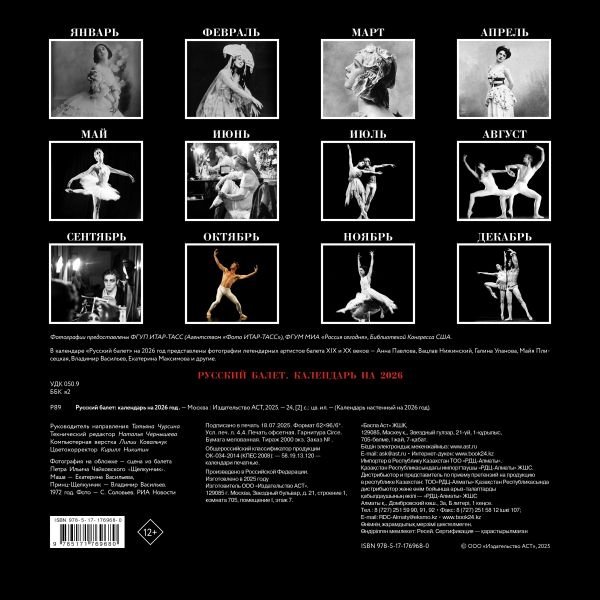 В календаре "Русский балет" на 2026 год представлены фотографии легендарных артистов балета XIX и ХХ веков — Анна Павлова, Вацлав Нижинский, Галина Уланова, Майя Плисецкая, Владимир Васильев, Екатерина Максимова и другие.