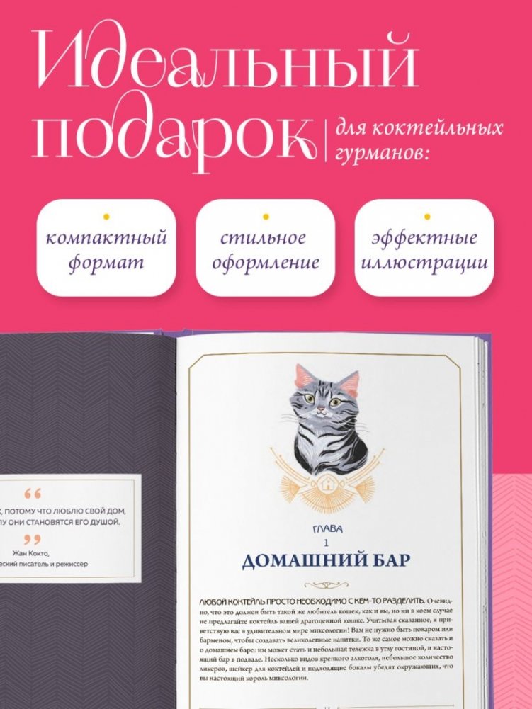 Только представьте: вечер пятницы, вкуснейший коктейль и кот, мирно сопящий на ваших коленях… Мечта, правда? Если у вас нет пушистого питомца, не беда: на страницах этой книги вы встретите самых разных кошек и узнаете увлекательную историю каждой из них. Коктейли, вдохновленные ими, сразят вас наповал — от "Великого крысолова" с джином и абрикосовым ликером до "Хвостатых историй" с водкой и медовым сиропом. Смешивайте коктейли, наслаждайтесь их вкусом и открывайте для себя удивительные истории о кошках, которые точно завоюют ваше сердце!