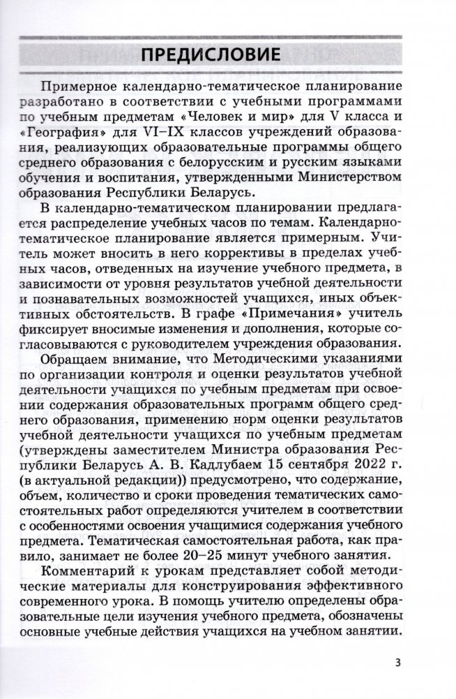 Примерное календарно-тематическое планирование разработано в соответствии с учебными программами по учебным предметам "Человек и мир" для V класса и "География" для VI-IX классов учреждений образования, реализующих образовательные программы общего среднего образования с белорусским и русским языками обучения и воспитания, утвержденными Министерством образования Республики Беларусь.