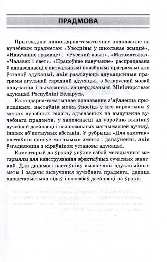 Прыкладнае каляндарна-тэматычнае планаванне па вучэбным прадметам "Уводзіны ў школьнае жыццё", "Навучанне грамаце", "Русский язык", "Матэматыка", "Чалавек і свет", "Працоўнае навучанне" распрацавана ў адпаведнасці з актуальнымі вучэбнымі праграмамі для ўстаноў адукацыі, якія рэалізуюць адукацыйныя праграмы агульнай сярэдняй адукацыі, з беларускай мовай навучання і выхавання, зацверджанымі Міністэрствам адукацыі Рэспублікі Беларусь.