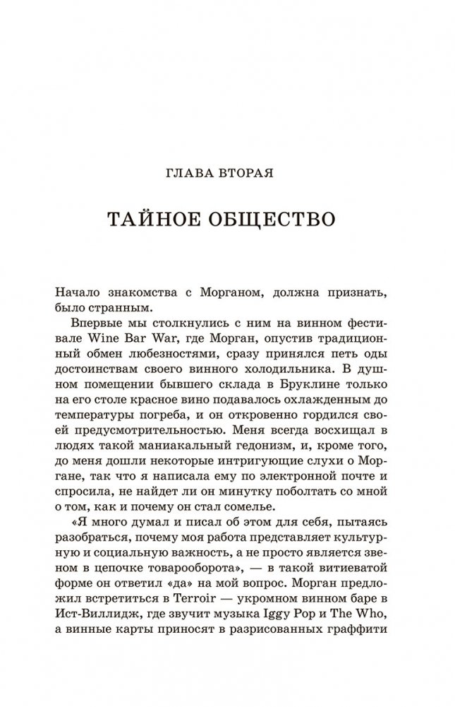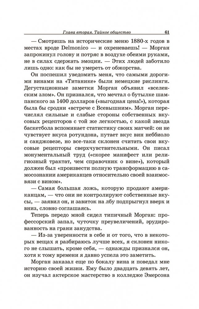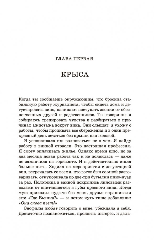Это не столько путешествие от виноградной лозы до бокала, сколько путь от бокала по пищеводу — в дикий мир одержимости вином и любви к нему во всех его формах и со всеми изъянами. Это исследование прочной связи с напитком с 7000-летней историей, занимавшим почетное место на столе египетских фараонов, бедных крестьян, русских царей, магнатов с Уолл-стрит, добропорядочных родителей из мирных пригородов и китайских студентов.