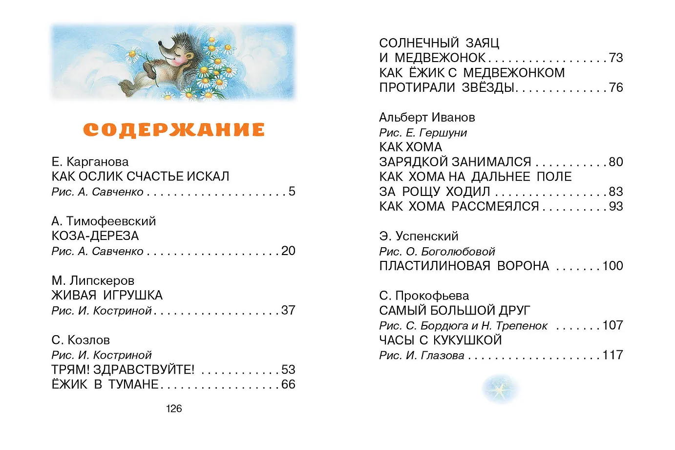 В книгу "Сказки-мультфильмы" вошли известные произведения детских писателей: Э. Успенского, С. Козлова, С. Прокофьевой и других. По этим сказкам создали замечательные мультфильмы: истории про хитрого Хому и доверчивого Суслика, трогательных Ёжика и Медвежонка, ленивую Козу-дерезу… Иллюстрации в книге нарисовали художники А. Савченко, И. Кострина и Е. Гершуни. Для детей до 3-х лет.