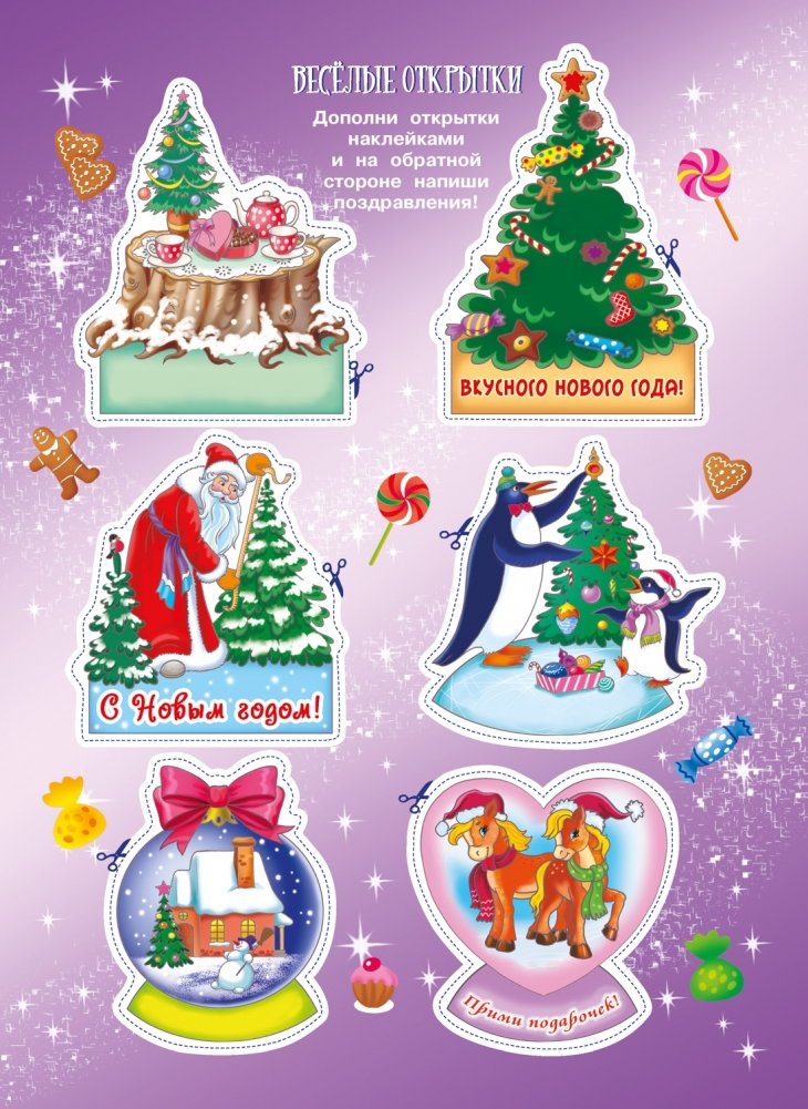 Книги напечатаны на плотной мелованной бумаге, из которой очень удобно вырезать поделки, и в них также есть разворот с наклейками – ими можно украсить открытки и игрушки для елки, а также приклеить, куда душа пожелает.
