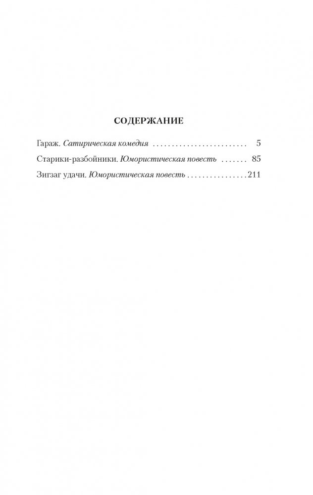 В книгу вошли три киноповести великолепного творческого дуэта Эльдара Рязанова и Эмиля Брагинского, ставшие основой комедий, вошедших в золотой фонд отечественного кинематографа: «Гараж», «Старики-разбойники», «Зигзаг удачи».