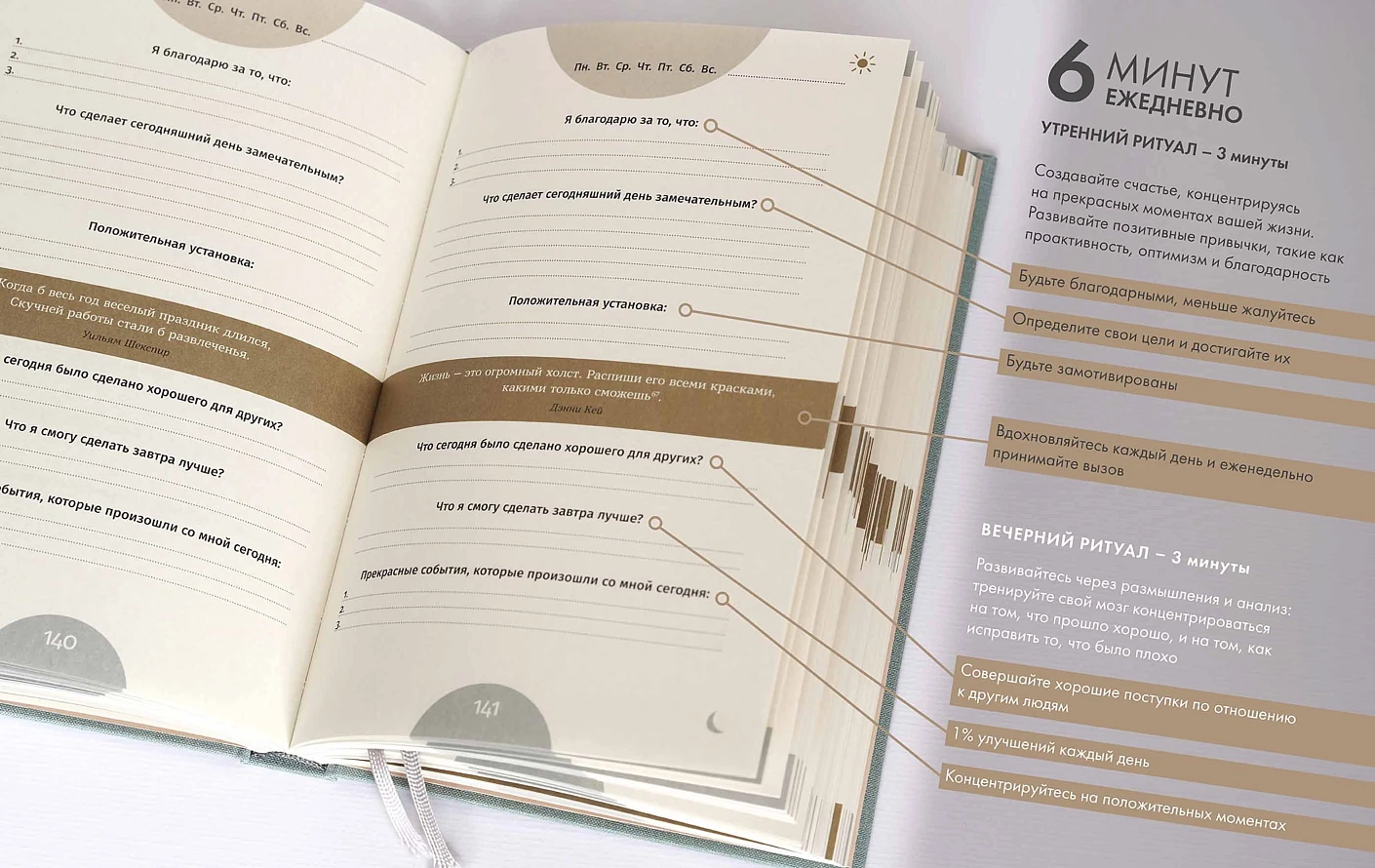 Проверенные на практике принципы позитивной психологии и нейробиологии помогут вам достичь целей, пережить трудные моменты, улучшить отношения с другими людьми и идти по жизни уверенно. С ежедневником вы сможете улучшать свою жизнь постоянно и проактивно, шаг за шагом и каждый день!