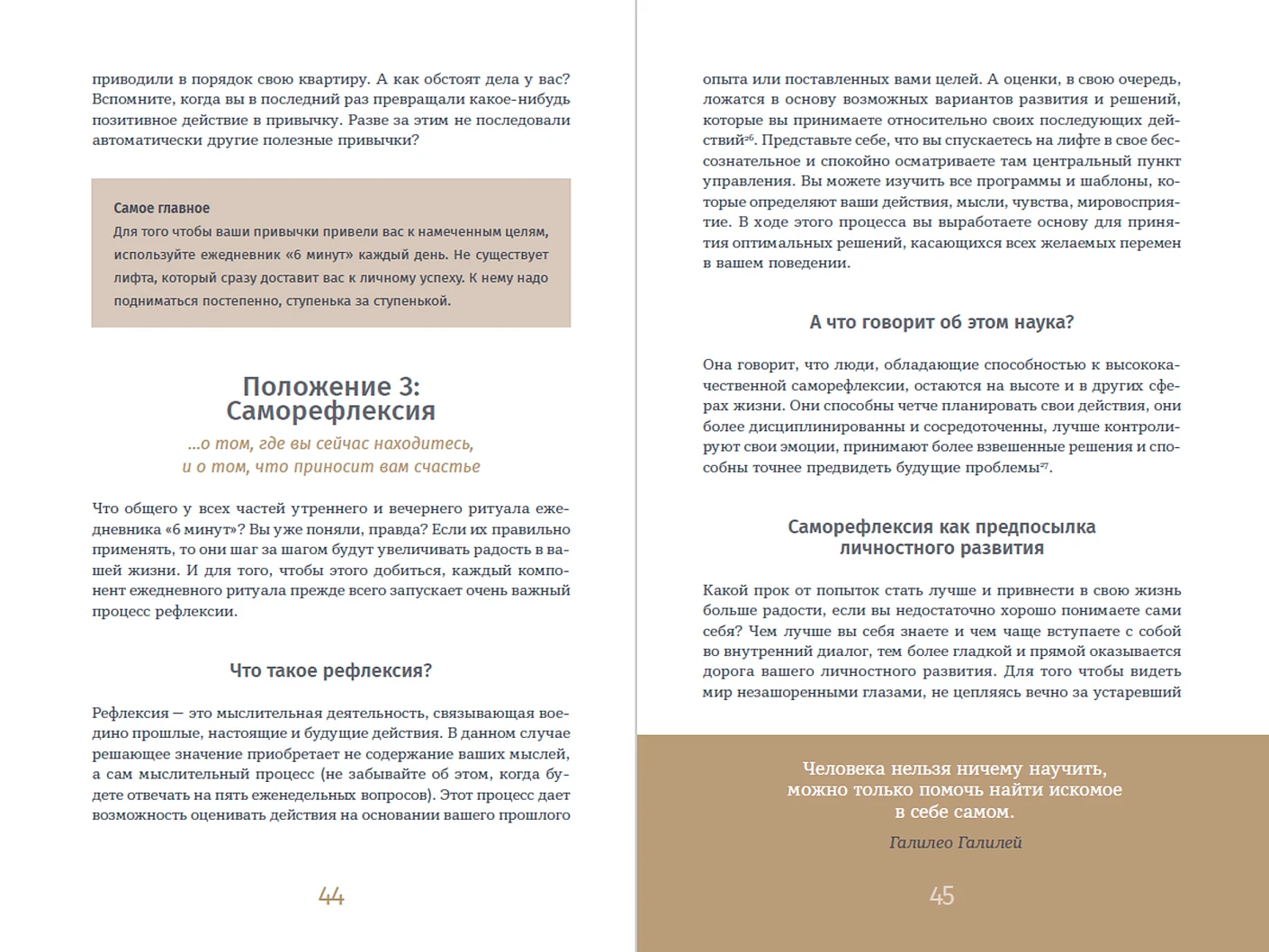 Счастье не является результатом везения или случайного стечения обстоятельств. Стать счастливым помогают правильные установки и образ мыслей. 3 минуты утром и 3 минуты вечером — столько времени займет выработка полезных привычек, которые сделают вашу жизнь осознаннее, гармоничнее, а значит — счастливее.