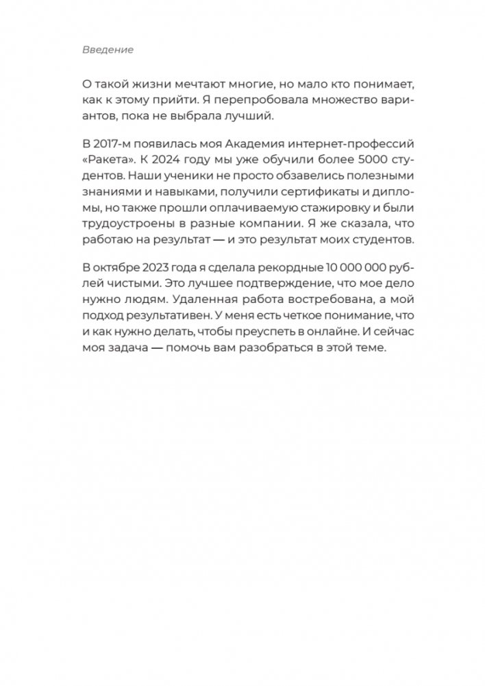 Желание жить лучше – это то, что объединяет сотни тысяч людей по всей стране. От Калининграда до Петропавловска-Камчатского, от Балтийска до Сочи огромное число женщин ищут подходящую работу. Им важно получать достойные деньги, но пахать в две смены без выходных и не видеть семью они не согласны. Книга поможет найти идеальную работу и реализовать свои мечты.