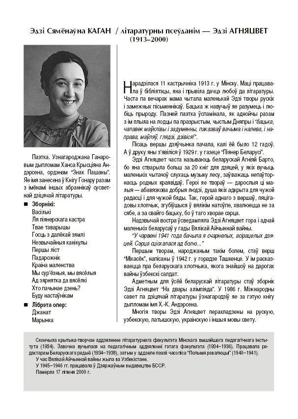 - спісы аўтарскіх зборнікаў для дзяцей малодшага школьнага ўзросту; кароткі агляд жыццёвага і творчага шляху кожнага пісьменніка.