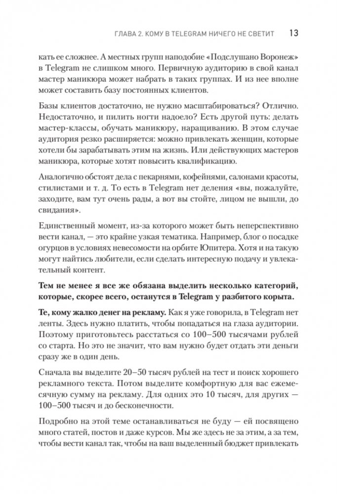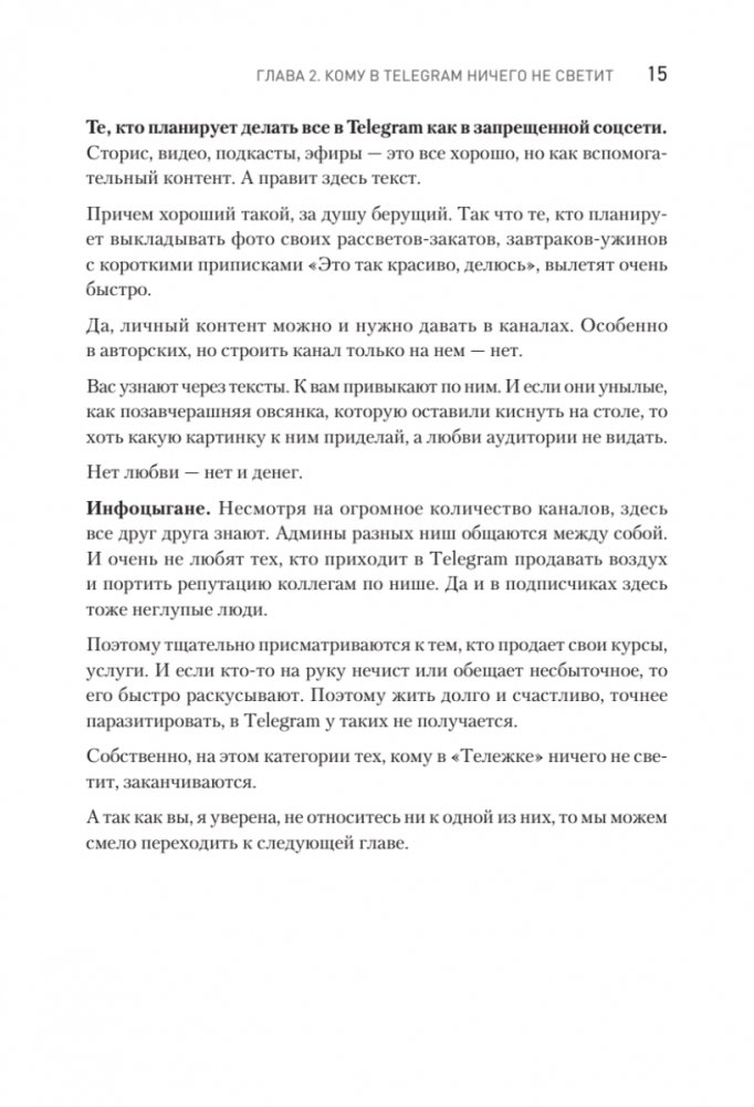 Книга наполнена примерами, формулами и структурами, чтобы каждый, кто до этого даже не вел свой канал в Telegram, мог взять и применить их на практике. Все материалы основываются на личном опыте контент-маркетолога, работающего с ТОПовыми агентствами по трафику в Telegram и онлайн-школами.