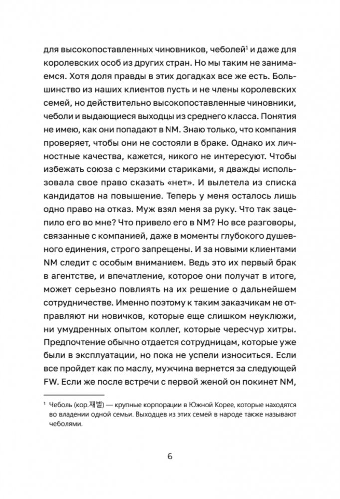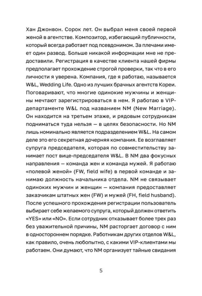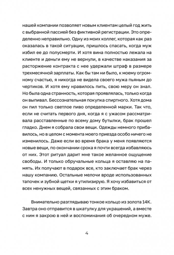 Четыре обручальных кольца едва заметно поблескивают на ладони Но Инджи. Она "временная жена" в элитном агентстве, где брак — это спектакль: безупречные церемонии, ночные объятия без страсти, уютные ужины без тепла. В New Marriage не любят, когда задают вопросы. Правда для них — лишний багаж, который на борт стараются не брать. Здесь нет места чувствам. Инджи знает об этом как никто другой. Но что-то меняется, когда один из ее прежних "мужей" вновь возникает перед глазами. Холодные улицы Сеула, пустые квартиры, чужие постели — где-то среди этого должна быть настоящая Но Инджи. Если, конечно, ее еще можно найти.