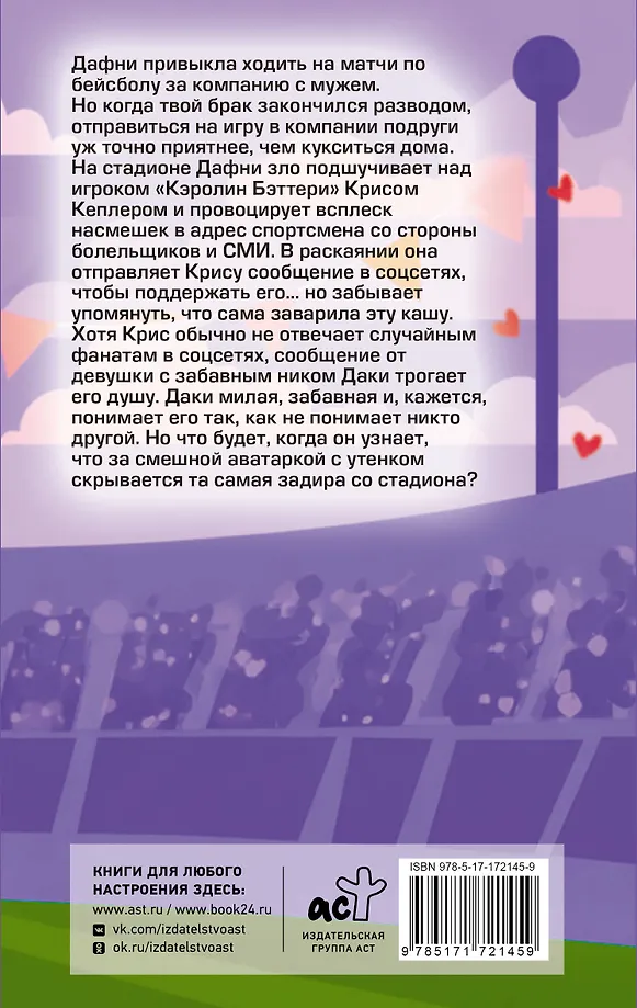 Дафни привыкла ходить на матчи по бейсболу за компанию с мужем. Но когда твой брак закончился разводом, отправиться на игру в компании подруги уж точно приятнее, чем кукситься дома. На стадионе Дафни зло подшучивает над игроком "Кэролин Бэттери" Крисом Кеплером и провоцирует всплеск насмешек в адрес спортсмена со стороны болельщиков и СМИ. В раскаянии она отправляет Крису сообщение в соцсетях, чтобы поддержать его... но забывает упомянуть, что сама заварила эту кашу. Хотя Крис обычно не отвечает случайным фанатам в соцсетях, сообщение от девушки с забавным ником "Даки" трогает его душу. Даки милая, забавная и, кажется, понимает его так, как не понимает никто другой. Но что будет, когда он узнает, что за смешной аватаркой с утенком скрывается та самая задира со стадиона?