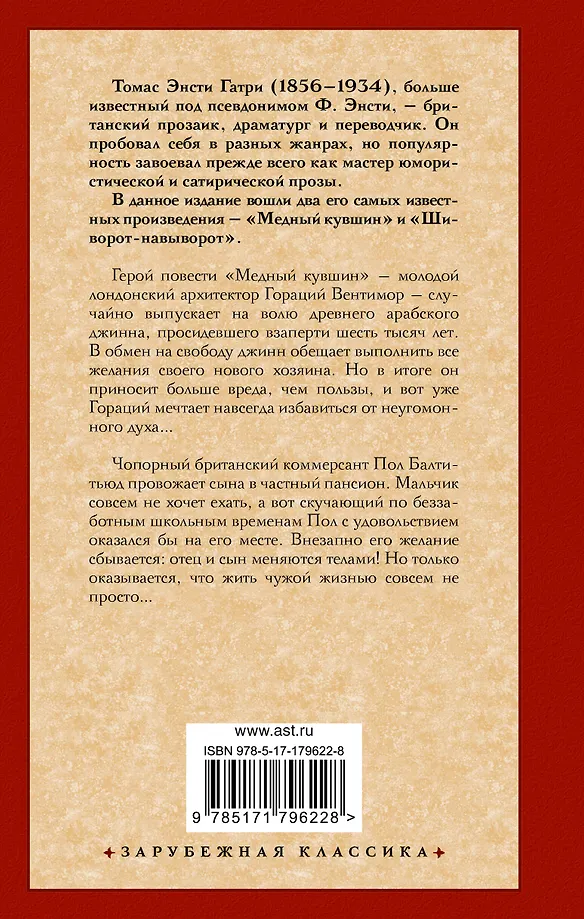 Герой повести "Медный кувшин" — молодой лондонский архитектор Гораций Вентимор — случайно выпускает на волю древнего арабского джинна, просидевшего взаперти шесть тысяч лет. В обмен на свободу джинн обещает выполнить все желания своего нового хозяина. Но в итоге он приносит больше вреда, чем пользы, и вот уже Гораций мечтает навсегда избавиться от неугомонного духа… Чопорный британский коммерсант Пол Балтитьюд провожает сына в частный пансионат. Мальчик совсем не хочет ехать, а вот скучающий по беззаботным школьным временам Пол с удовольствием оказался бы на его месте. Внезапно его желание сбывается: отец и сын меняются телами! Но только оказывается, что жить чужой жизнью совсем не просто…