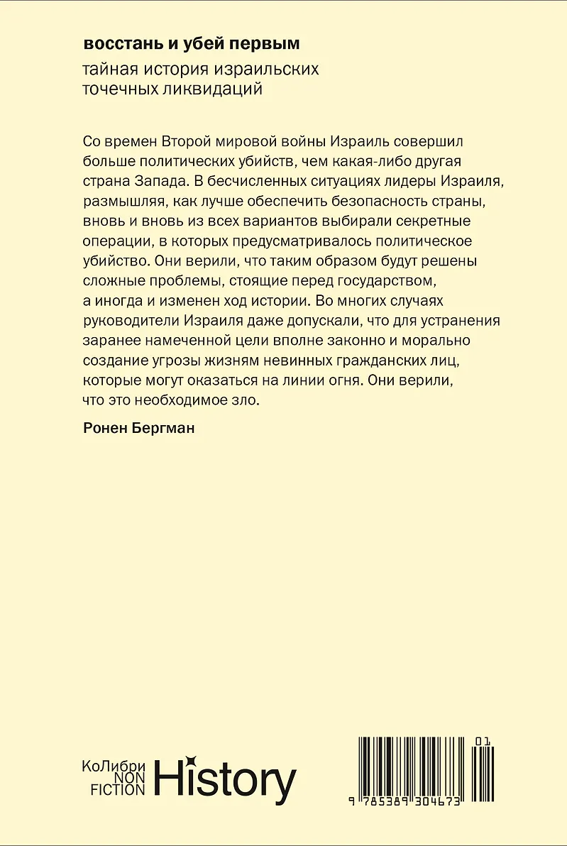 Создание государства Израиль в 1948 году привело к созданию его разведки — самой смертоносной в мире. В ее арсенале всегда было особое оружие: политические убийства. «Целевые» убийства применялись бесчисленное количество раз, как против больших, так и малых врагов, в том числе превентивно. Эта книга основана на ранее тщательно засекреченных архивных материалах и интервью, ни одно из которых не получило одобрения военной элитой Израиля. Известный военный аналитик Ронен Бергман предлагает захватывающий рассказ о программах целевых убийств: об их успехах и неудачах, а также моральной и политической цене, которую пришлось заплатить тем, кто одобрил и выполнил эти миссии.