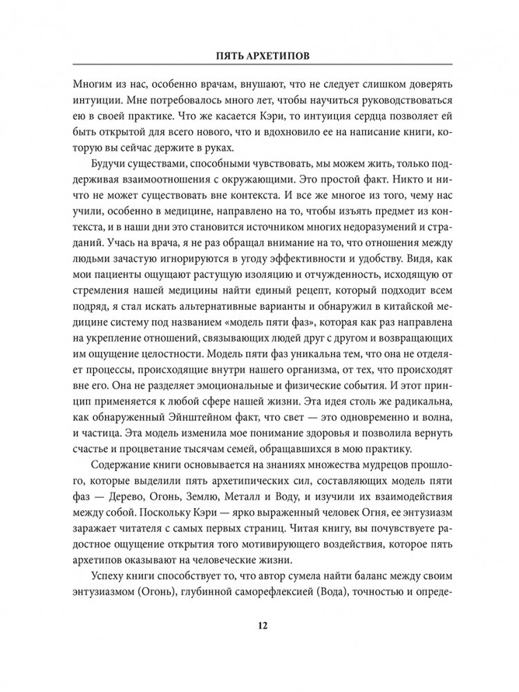В основе традиционной китайской медицины и философии лежат такие элементы, как Дерево, Огонь, Земля, Металл и Вода. Считается, что они помогают нам постичь суть всех явлений — от болезни и выздоровления до фундаментальных процессов развития. Они используются в восточных практиках по сей день. В своей книге Кэри Дэвидсон, специалист по аюрведическому питанию, мастер рейки и основатель оздоровительного центра, демонстрирует, что каждый из этих пяти элементов можно рассматривать и как архетипы личности. В любом человеке присутствует их уникальное сочетание, понимание которого способно привести нас к более полной и насыщенной жизни в любом ее проявлении. Знание характеристик, которые ассоциируются с каждым архетипом, поможет изменить вашу модель поведения в общении с друзьями, партнерами, родными, детьми и коллегами. Практикуясь в использовании этого метода, вы сможете также: * научиться контролировать свои действия, препятствующие раскрытию потенциала * укрепить уверенность в себе и стрессоустойчивость * понять мотивы поведения окружающих, чтобы не тратить зря время на изжившие себя отношения и посвящать его перспективному общению Изучение пяти архетипов и личные наблюдения, сделанные автором на основе профессионального опыта, позволили ей создать простые и практичные инструкции для выявления наших сильных сторон. Они помогут вам лучше разобраться в себе и окружающих, внести изменения в свои отношения и встать на путь достижения личной и межличностной гармонии.