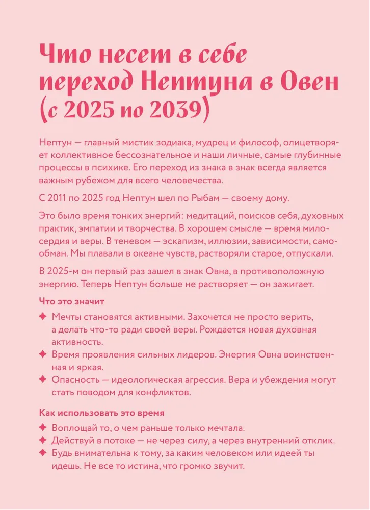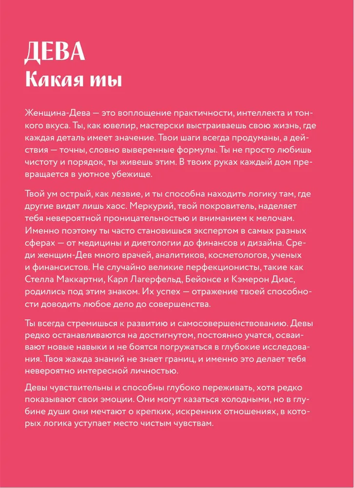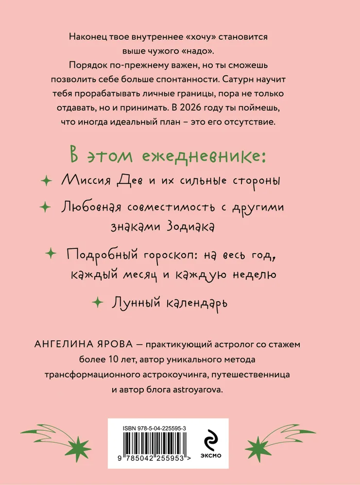 Наконец твоё внутреннее "хочу" становится выше чужого "надо".Порядок по-прежнему важен, но ты сможешь позволить себе больше спонтанности. Сатурн научит тебя прорабатывать личные границы, пора не только отдавать, но и принимать. В 2026 году ты поймешь, что иногда идеальный план – это его отсутствие. В этом ежедневнике: миссия Дев и их сильные стороны, любовная совместимость с другими знаками Зодиака, подробный гороскоп: на весь год, 12 месяцев и каждую неделю, лунный календарь.