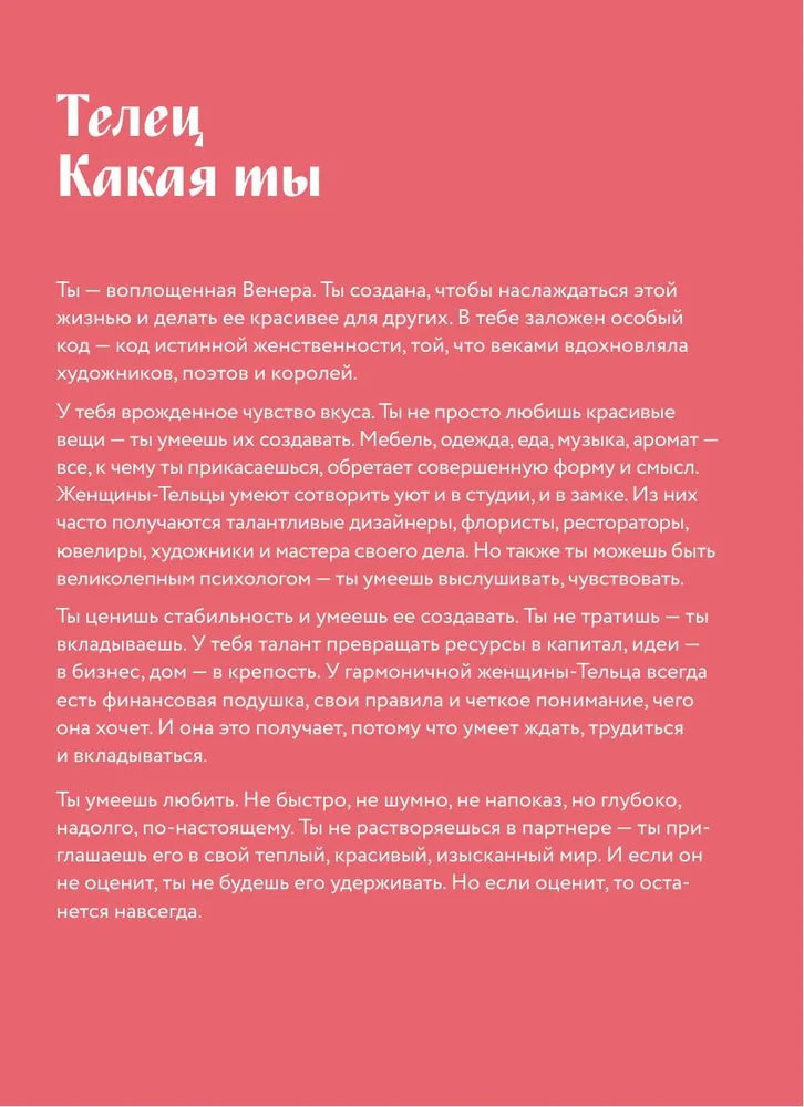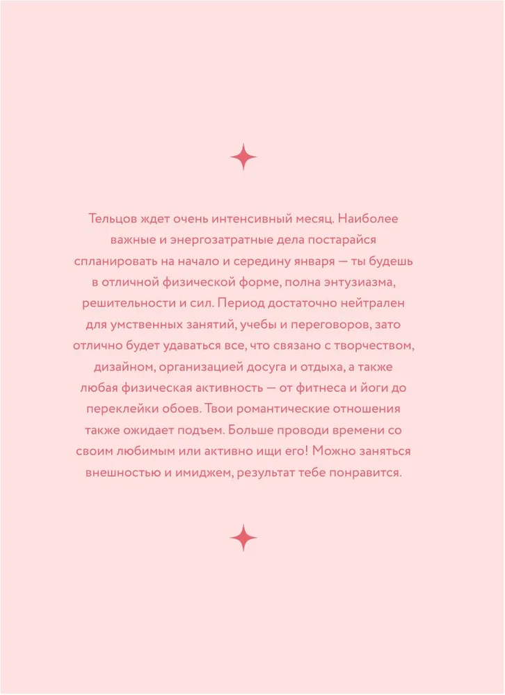 Уже с весны ты почувствуешь, что пора избавляться от лишнего – в вещах, делах и людях. Меньше суеты, больше глубины. Твои финансовые вопросы решатся через новые источники дохода, а личная жизнь обретёт устойчивость. 2026 год, словно мягкий диван, подарит чувство опоры и понимание того, что ты на своем месте. И пусть весь мир подождет… В этом ежедневнике: миссия Тельцов и их сильные стороны, любовная совместимость с другими знаками Зодиака, подробный гороскоп: на весь год, 12 месяцев и каждую неделю, лунный календарь.