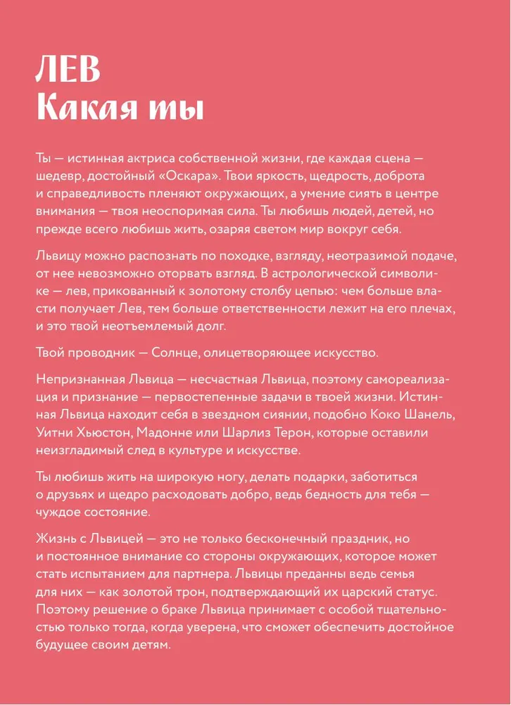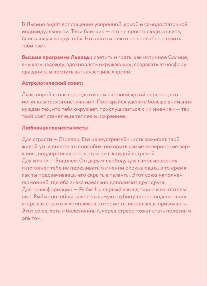 2026 год вернет Львам уверенность, драйв и жажду свершений. После нескольких лет внутренней перестройки пора возвращаться на сцену яркой и вдохновленной. Звезды будут подбрасывать тебе новые роли и вызовы: будь готова громко заявить о себе. В этом ежедневнике: миссия Львов и их сильные стороны, любовная совместимость с другими знаками Зодиака, подробный гороскоп: на весь год, 12 месяцев и каждую неделю, лунный календарь.