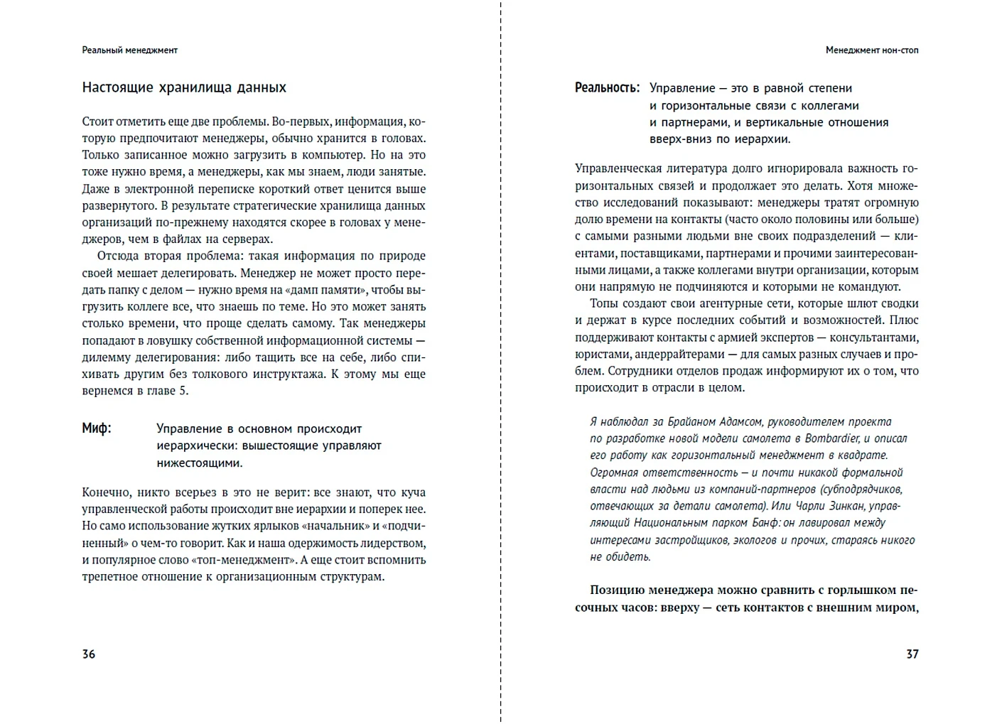 На основании исследования реальной работы руководителей из самых разных отраслей он доказывает, что эффективное лидерство неотделимо от повседневной управленческой работы, а попытка быть «чистым» лидером, оторванным от рутины, — один из главных мифов, который мешает добиваться реальных результатов. Минцберг описывает реальный мир управления: бешеный темп, постоянные помехи и переключения, хаос, противоречивость и фрагментарность задач.