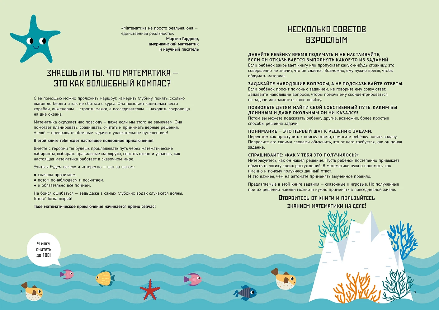 Книга построена как подводное приключение, в котором ребёнок вместе с героями — осьминогом Инки, морской звездой Селией и окунём Бобом — отправляется в загадочный Океан Вычислений. Каждая глава — это новая история и новая математическая задача: нужно зарядиться энергией чисел, разгадать тайну икринок, пройти через коралловый лабиринт, починить разрушенный риф, обхитрить кальмаров и даже победить в математическом турнире.