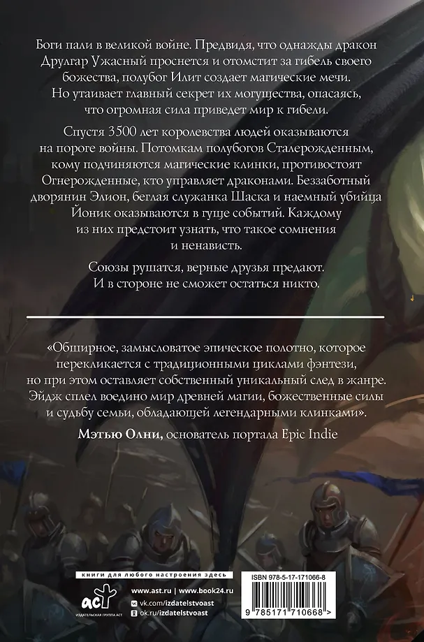 Боги пали в великой войне. Предвидя, что однажды дракон Друлгар Ужасный проснется и отомстит за гибель своего божества, полубог Илит создает магические мечи. Но утаивает главный секрет их могущества, опасаясь, что огромная сила приведет мир к гибели. Спустя 3500 лет королевства людей оказываются на пороге войны. Потомкам полубогов Сталерожденным, кому подчиняются магические клинки, противостоят Огнерожденные, кто управляет драконами. Беззаботный дворянин Элион, беглая служанка Шаска и наемный убийца Йоник оказываются в гуще событий. Каждому из них предстоит узнать, что такое сомнения и ненависть. Союзы рушатся, верные друзья предают. И в стороне не сможет остаться никто.