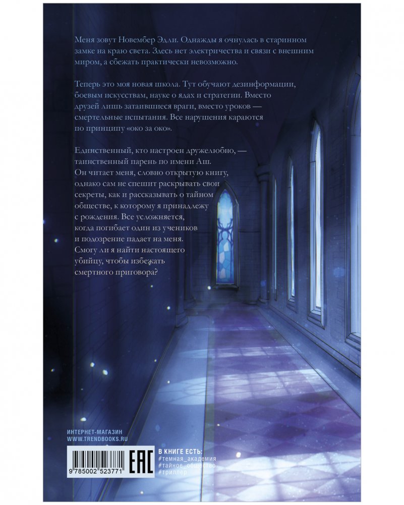 Однажды Новембер Эдли очнулась в старинном замке на краю света. Это ее новая школа? Без электричества, связи с внешним миром и возможности убежать. В загадочной академии обучают дезинформации, манипулированию, боевым искусствам, науке о ядах. Вместо друзей — лишь затаившиеся враги, вместо уроков — смертельные испытания. Единственный, кто настроен дружелюбно, — таинственный парень по имени Аш. Он читает Новембер словно открытую книгу, но сам не спешит раскрывать свои секреты. Все усложняется, когда погибает один из учеников и подозрение падает на Новембер. Сможет ли она найти настоящего убийцу, чтобы избежать смертного приговора и раскрыть тайны академии?