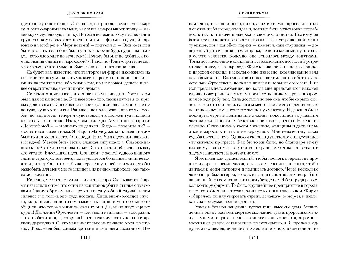 «Сердце тьмы» — безусловный шедевр, погружающий в неразгаданную бездну человеческой природы, обнажая скрытые в ней тени. Упорные поиски загадочного торговца слоновой костью, засевшего в глубине джунглей, ведут рассказчика в верховья реки Конго, и по мере продвижения в джунгли он сам и его окружение все больше теряют связь с реальностью, проникая во тьму, что таится в человеческом сердце.