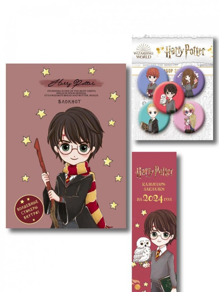В комплект для поклонников книг о юном волшебнике вошли блокнот, календари-закладки и значки с героями знаменитой сказочной истории
