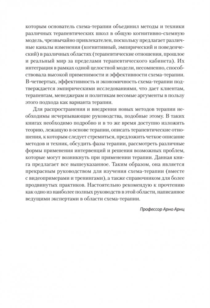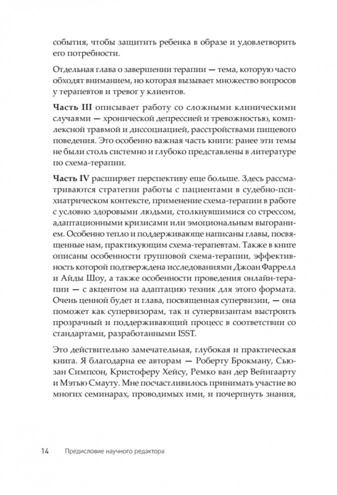 Эта книга дает максимально полное представление о схема-терапии: ее модели, современных исследованиях в этой области, основных группах техник: экспериенциальных, когнитивных, поведенческих, а также техник, связанных с терапевтическими отношениями. Кроме того, авторы описывают работу со сложными клиническими случаями — хронической депрессией и тревожностью, комплексной травмой и диссоциацией, расстройствами пищевого поведения, предоставляя пошаговые инструкции и клинические примеры. Также раскрываются особенности групповой схема-терапии и особенности проведения онлайн-терапии — с акцентом на адаптацию техник для этого формата. Одна из глав посвящена супервизии, она будет полезна как супервизорам, так и супервизантам. Уникальность этого издания в том, что оно поможет усовершенствовать практику и стажерам, и экспертам-клиницистам.