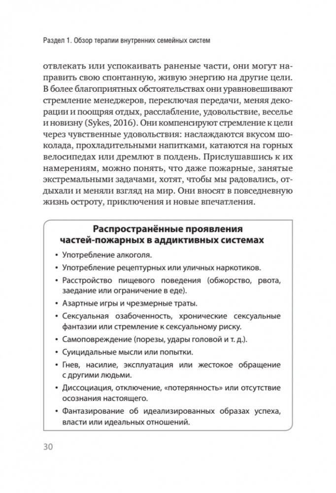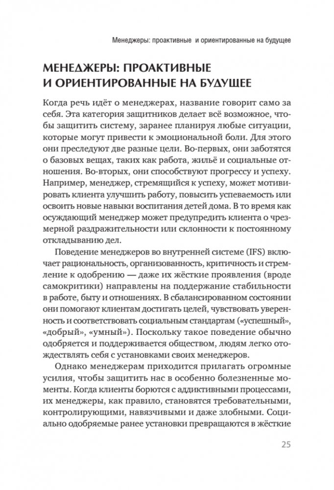 Часто зависимость рассматривается как болезнь или неконтролируемая привычка, которая сигнализирует о недостатке силы воли. Подход IFS предлагает сменить парадигму. Авторы этой книги считают, что зависимое поведение — это выбор ценной внутренней сущности (части), которая в прошлом отчаянно пыталась спасти человека и, убежденная, что должна продолжать эту работу (иначе случится нечто ужасное), застряла в своей защитной роли, сейчас уже деструктивной. Иными словами, зависимые части нередко отчаянно пытаются притупить наши болезненные эмоции: вину, стыд, ужас — либо удержать других «страшных» защитников, таких как ненависть к себе или суицидальные мысли. Следовательно, то, что они защищают, необходимо исцелить или изменить, прежде чем эти части прекратят активность. В книгу включены практические упражнения не только для клиентов, но и для терапевта, которые помогут ему исследовать свои внутренние части, вовлечённые в конфликт вокруг зависимости, и научиться принимать их.