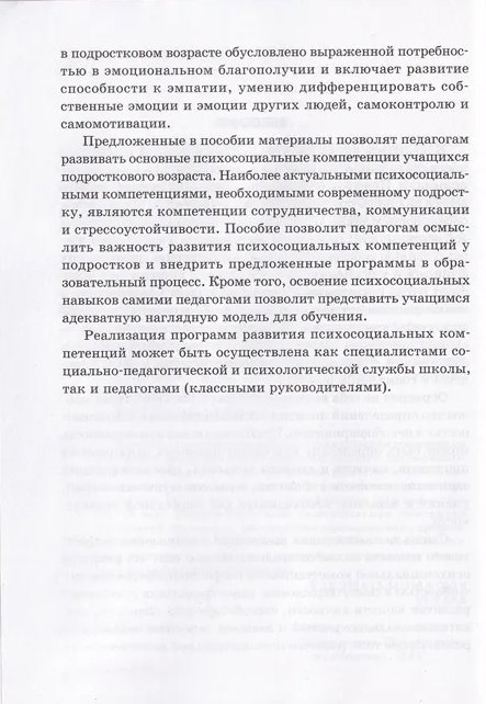 В пособии представлены проблемы социализации современных подростков, связанные с необходимостью развития психосоциальных компетенций, а также программы развития компетенций сотрудничества (для подростков 11-14 лет), коммуникации (для подростков 14—16 лет) и стрессоустойчивости (для подростков 16-18 лет). Пособие адресовано педагогическим работникам учреждений образования, реализующих образовательные программы общего среднего образования, с белорусским и русским языками обучения и воспитания и может быть использовано педагогами дополнительного образования.