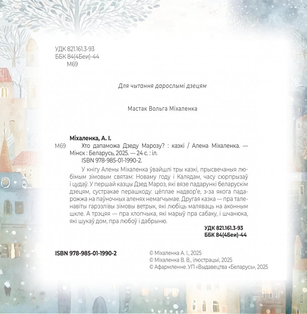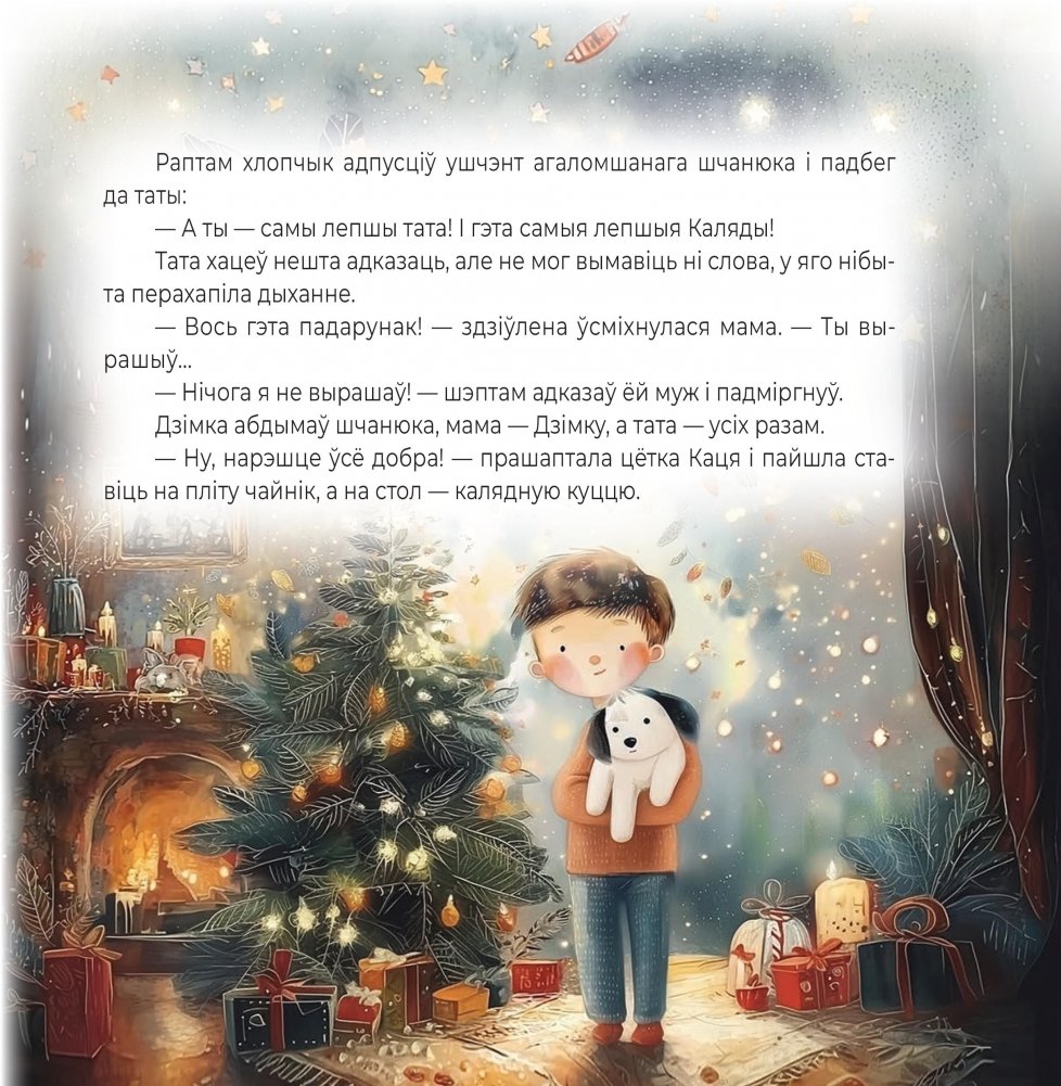 У кнігу Алены Міхаленка ўвайшлі тры казкі, прысвечаныя любімым зімовым святам: Новаму году і Калядам, часу сюрпрызаў і цудаў. У першай казцы Дзед Мароз, які вязе падарункі беларускім дзецям, сустракае перашкоду: цёплае надвор’е, з-за якога падарожжа на паўночных аленях немагчымае. Другая казка — пра таленавіты гарэзлівы зімовы ветрык, які любіць маляваць на аконным шкле. А трэцяя — пра хлопчыка, які марыў пра сабаку, і шчанюка, які шукаў дом, пра любоў і дабрыню.