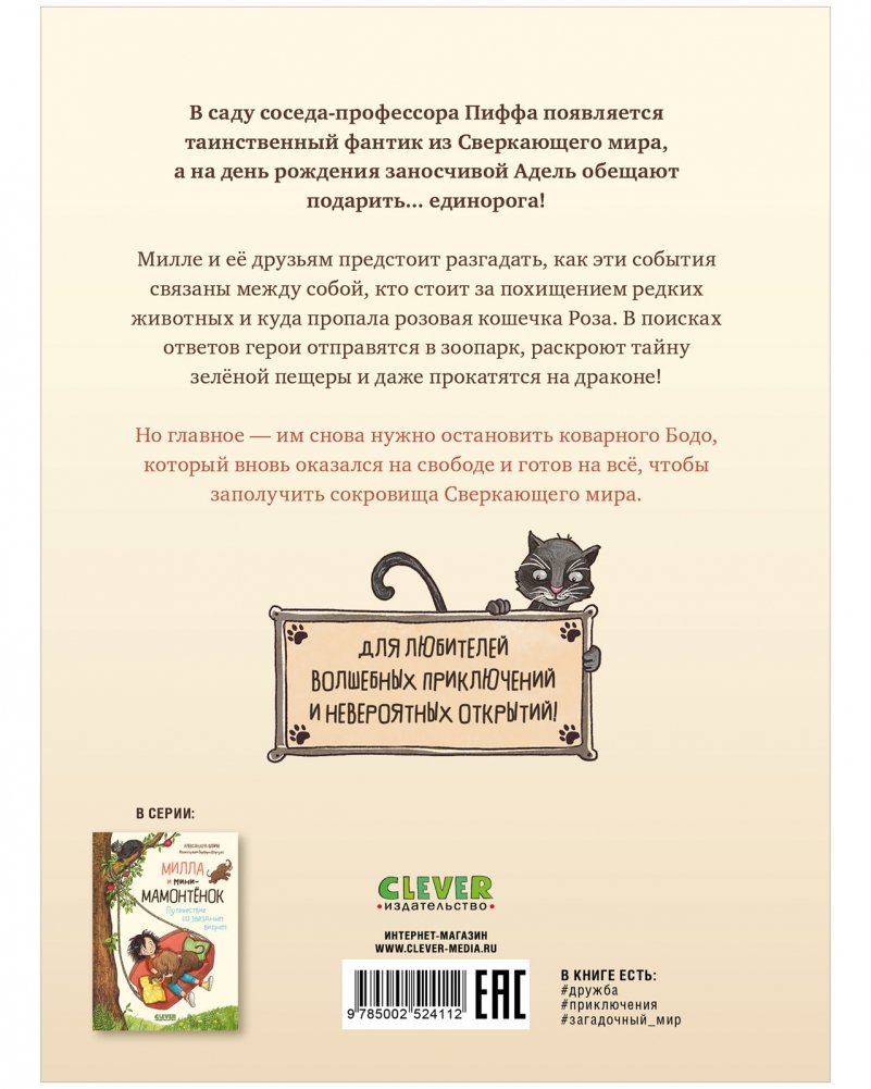 В саду соседа-профессора Пиффа появляется таинственный фантик из Сверкающего мира, а на день рождения заносчивой Адель обещают подарить... единорога! Милле и её друзьям предстоит разгадать, как эти события связаны между собой, кто стоит за похищением редких животных и куда пропала розовая кошечка Роза. В поисках ответов герои отправятся в зоопарк, раскроют тайну зелёной пещеры и даже прокатятся на драконе! Но главное — им снова нужно остановить коварного Бодо, который вновь оказался на свободе и готов на всё, чтобы заполучить сокровища Сверкающего мира.