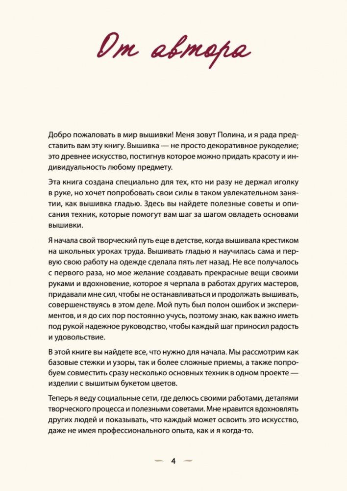 В книге вы найдете пошаговые инструкции по выполнению разнообразных стежков, швов и цветочных элементов — от самых простых до более сложных, а понятные фотографии помогут освоить технику вышивки даже тем, кто никогда раньше не держал иголку в руках.