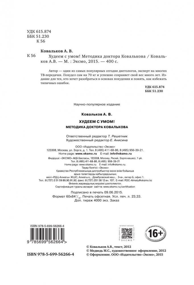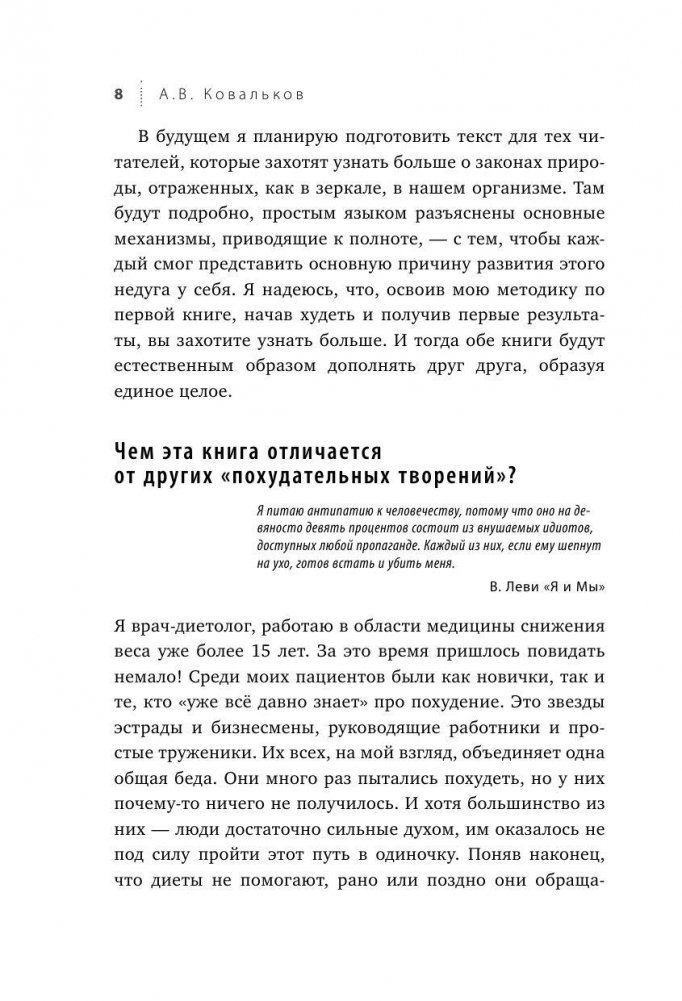 В этом издании представлена авторская методика похудения доктора А,В. Ковалькова, известного врача-диетолога, ведущего российского специалиста по лечению ожирения, также выступающего экспертом во многих телевизионных передачах. Методика доктора Ковалькова, опираясь на глубокие медицинские знания и практические наработки, а также проверенная на собственном опыте, нацелена на эффективное похудение и оздоровление организма. Автор, похудев на 70 кг, много лет успешно поддерживает свою форму. В книге изложены детальные практические рекомендации по программе снижения веса, которые помогут тем, кто хочет укрепить здоровье и иметь стройную красивую фигуру.