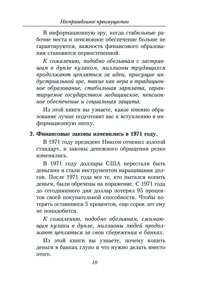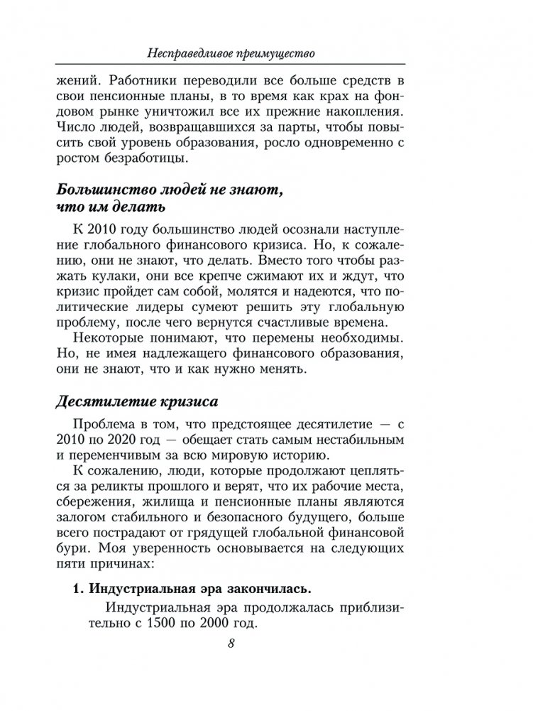 Книга «Несправедливое преимущество» заставит всех нас отказаться от стереотипа, что мы должны постоянно едва сводить концы с концами. Истинное финансовое образование дает вам шанс зажить такой жизнью, о которой вы всегда мечтали. Роберт Кийосаки призывает вас изменить то единственное, что вам под силу изменить, — себя. Это книга о финансовом образовании и о пяти преимуществах, которые оно вам предоставляет.