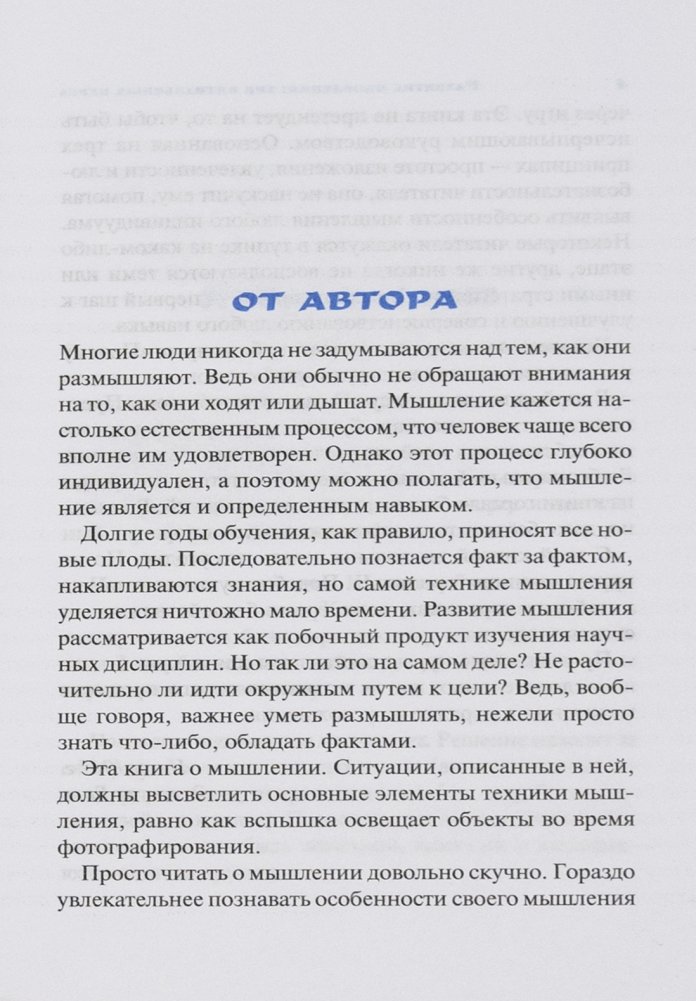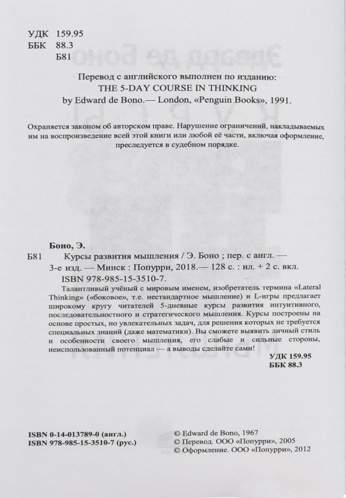 Талантливый ученый с мировым именем, изобретатель термина "Lateral Thinking" ("боковое", т.е. нестандартное мышление) и L-игры предлагает широкому кругу читателей 5-дневные курсы развития интуитивного, последовательностного и стратегического мышления. Курсы построены на основе простых, но увлекательных задач, для решения которых не требуется специальных знаний (даже математики). Вы сможете выявить личный стиль и особенности своего мышления, его слабые и сильные стороны, неиспользованный потенциал - а выводы сделайте сами!