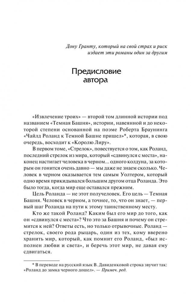 Юный Роланд - последний благородный рыцарь в мире, "сдвинувшемся с места". Ему во что бы то ни стало нужно найти Темную Башню - средоточие Силы, краеугольный камень мироздания. Когда-нибудь он отыщет эту башню, а пока ему предстоит долгий и опасный путь - путь по миру, которым правит черная магия, по миру, из которого порой открываются двери в нашу реальность...