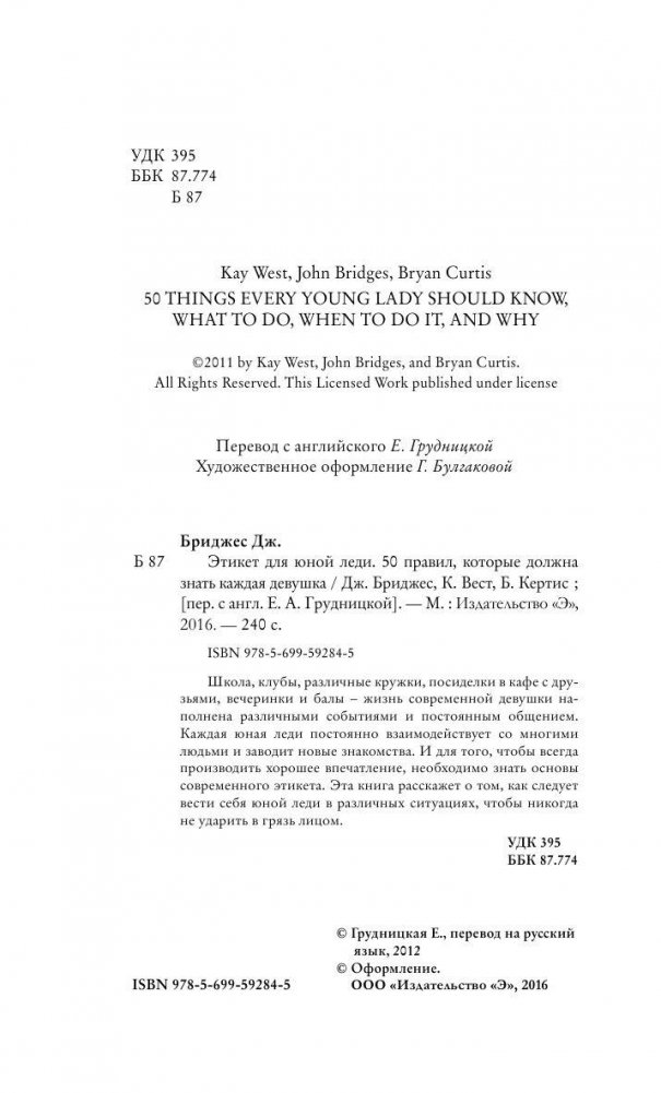 Благодаря этой книге юная леди узнает как: - вежливо общаться по телефону и переписке, - принимать и делать комплименты, - выражать благодарность и сочувствие, - правильно вести себя за столом, - следить за своим внешним видом. Отрывки: Леди знает, что слова «пожалуйста» вполне достаточно. Говорить «пожалуйста-пожалуйста» или «пожааааааалуйста» нет необходимости, и это раздражает. *** Леди не указывает на то, что какое-то блюдо способствует набору лишних килограммов, даже если оно действительно слишком калорийное. *** Леди не сует нос в дела других людей, не читает чужие дневники и письма и не подслушивает личные разговоры. В постоянно меняющемся мире хорошие манеры никогда не выйдут из моды!